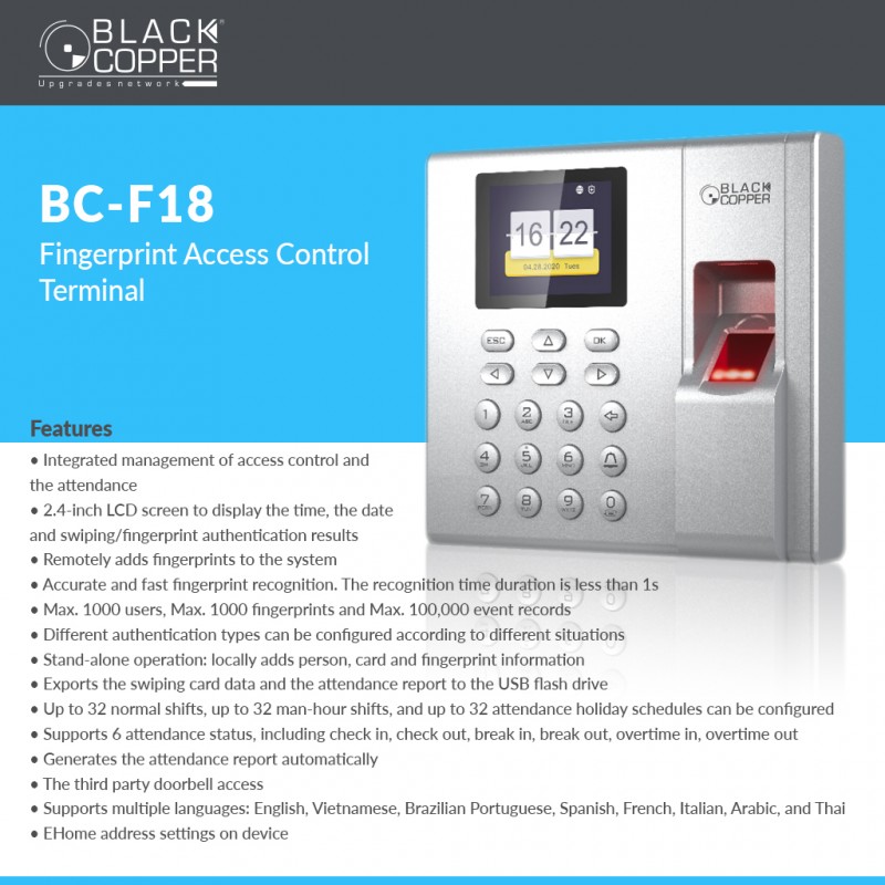 Buy Black Copper BC-F18 Biometric Access Control, – MB Communication is a Biometric Access Control Black Copper BC-F18 reseller in Pakistan offers BlackCopper products Biometric Access Control.